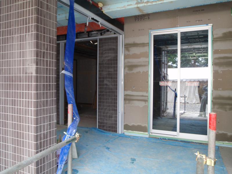 明るい南側に面した玄関が仕上がってきました。タイルが張られ落ち着いた上品なイメージになってきてます。