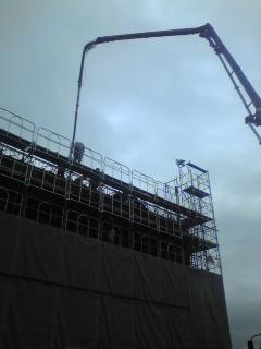 写真は、南陽市の沖郷小学校の現場です。コンクリート打設の真っ最中でした。写真はコンクリート圧送車のパイプですね。