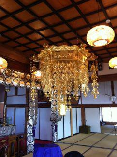 天蓋とは写真のような、お寺の本堂に吊るされている金色のシャンデリアのような飾りのことで、ご本尊の上の場合は仏天蓋、僧の上の場合は人天蓋というのだそうです。一つ賢くなりました。
