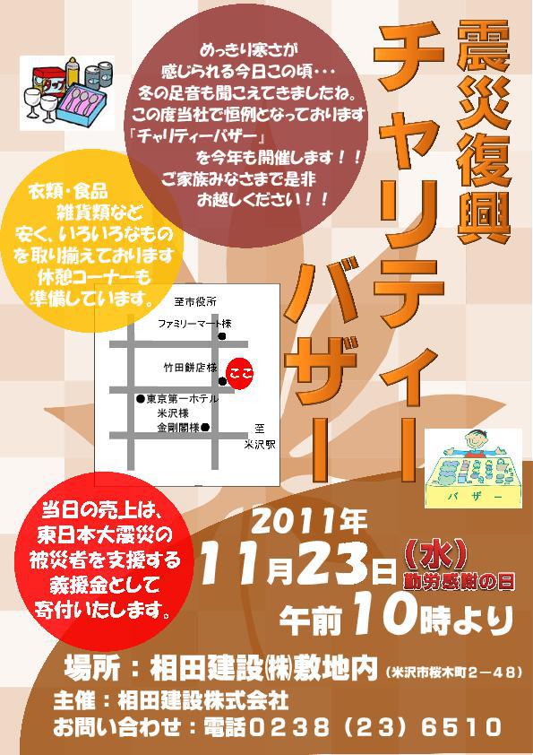 来る、11月23日(水)勤労感謝の日、弊社恒例となりましたチャリティーバザーを開催致します。今年は、東日本大震災義援金向けのチャリティーバザーとさせていただきます。今年も各方面、沢山の方々より品物をご協賛頂きました。この場をお借りし厚く御礼申し上げます。イイもの、掘り出し物、???な物、色々あって楽しいバザーとなりそうですので楽しみにしておいで下さい!。