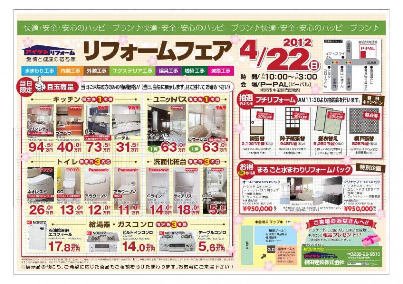 弊社恒例のリフォームフェアを4/22(日)P−PALで開催いたします。