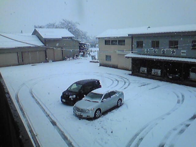 今朝の我社の駐車場。いやー、たまげた。今頃こんなに雪が降るなんてねぇー。これから富山に行くって言うのに、なんてこったい。
