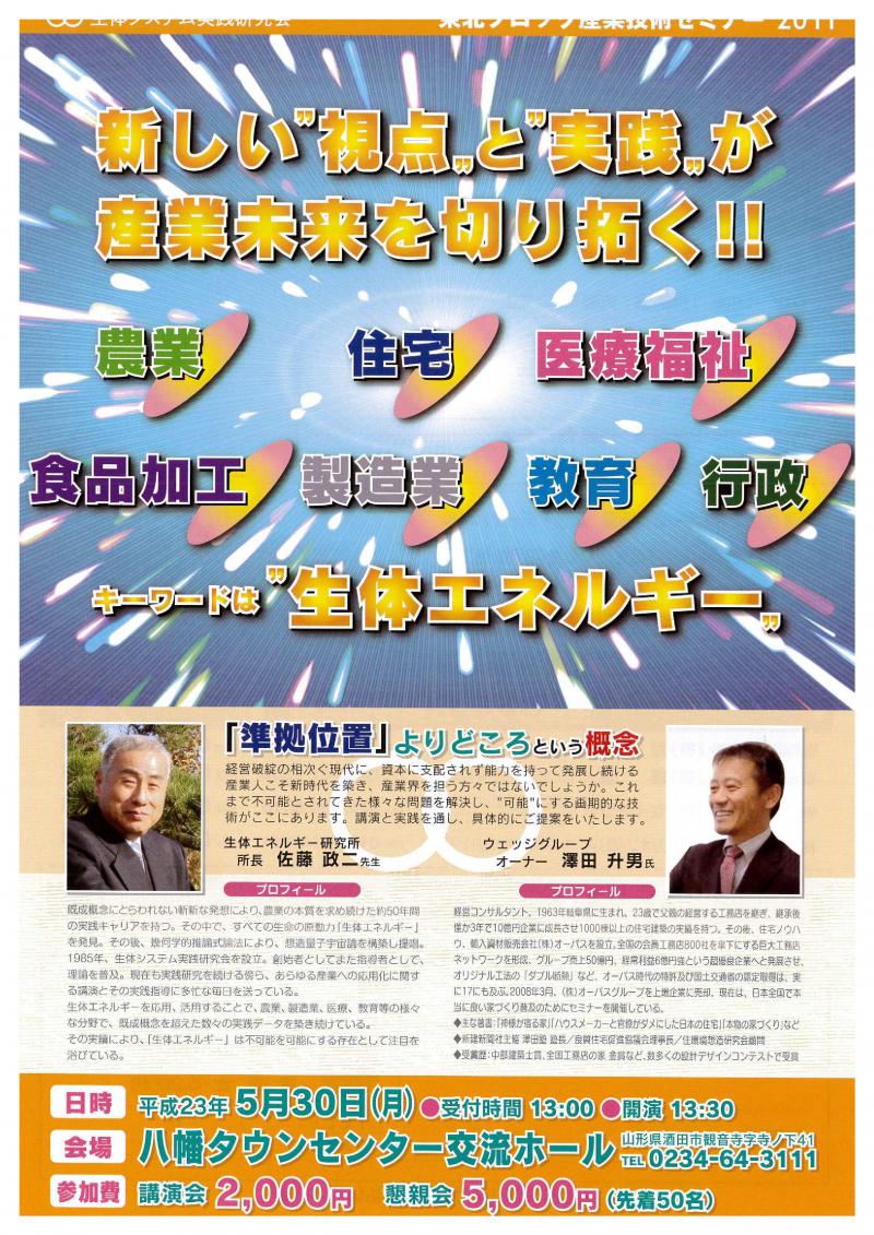 生体エネルギーを発見された佐藤先生、生体エネルギーを住宅産業に応用し、広めておられる澤田先生を講師に、実際のお話を直接お聞きできるまたとない機会です。ワタクシも参加し、更に勉強させていただきますし、弊社スタッフもお手伝いで参加します。