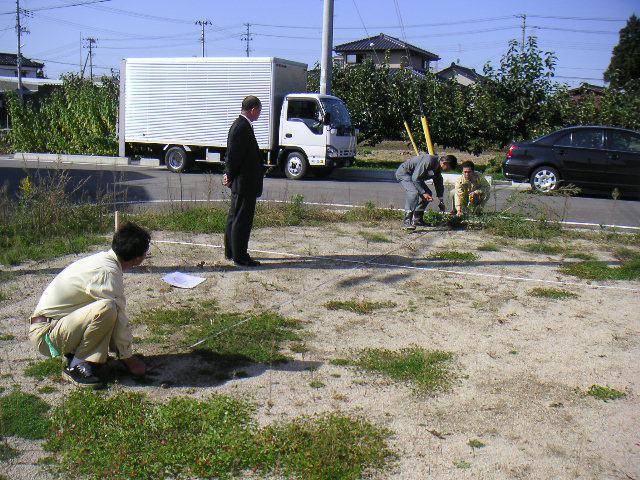 地鎮祭直前、地縄張りが行われ、建物の位置を確認しました。