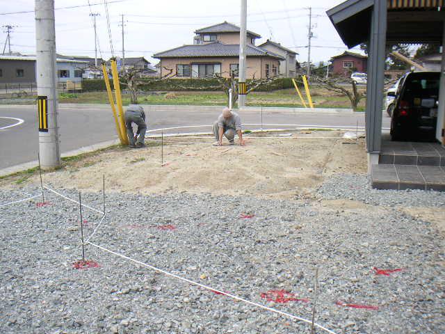 季節も良くなり、ようやく外構工事が始まりました。まずは地縄を張ってもらい、位置の確認。屋根からの雨落ちにコンクリート部分がかからないかで細かい調整はしましたが、ほぼ図面通りでお願いすることに。クライアントさんにも説明し、確認してもらいました。【The Clover House】