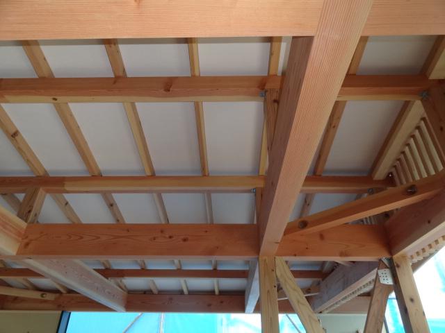 ▼車庫小屋組が美しい。『梁の見える家…増築…』