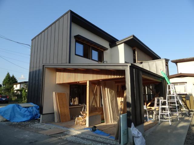 どんな容姿になっているのか。この日を楽しみにしていました。現地は住宅地内のうえ、手前で道路がL字に折れているため、直前まで姿が見えません。L字の角をワクワクしながら曲がると、完成形の姿が飛び込んできました。考えることは同じようで、夕方現地で打合せしていると、仕事を早めに切り上げて帰宅してきたクライアントのNさんでした。