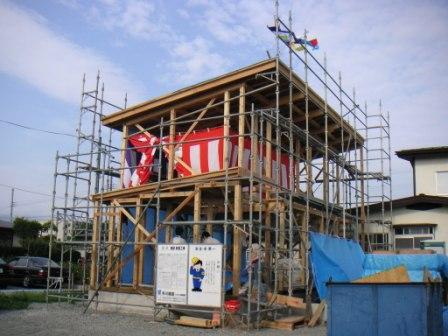 上棟式です。五色絹がたなびいています!