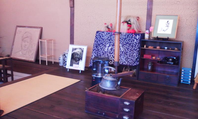 と、前置きはこれくらいにして、大町通り商店街の一番最後の曲がり角に お休み処があるのです。ここは 「かどのむらかみ」さんの商店の半分を地元工科短大の学生の卒業作品として改装し、土壁を塗って天井を黒く塗装し、畳をしいて・・・歩いて疲れた心をほわっとつつんでくれる場所です。