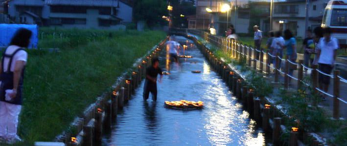 川岸にロウソクランタンを置き、川中にもランタンを浮かべて撞木川を優しい光でライトアップします。
