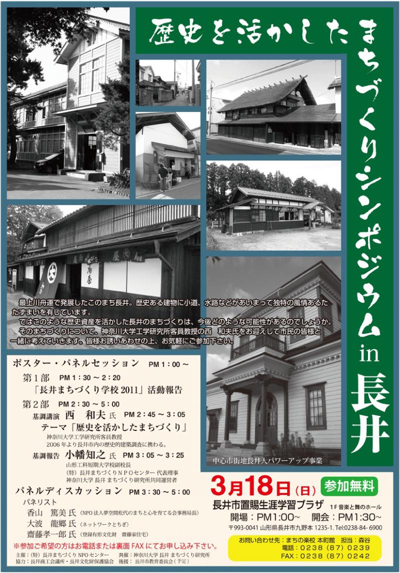 雪も大分溶け始め春の足音も近づいていますね。そんな中、神奈川大学工学研究所客員教授の西 和夫氏をお招きし「歴史を活かしたまちづくりシンポジウムin長井」を開催いたします。まちの歴史やまちづくりに興味のある方など興味がありましたら是非ご参加頂き、みなさんと一緒にまちづくりについて考えてみませんか?