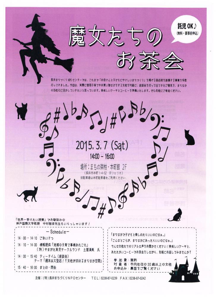 3月7日(土)「魔女たちのお茶会」を開催いたします子育て中のお母さんやまち中でお買い物をする女性を対象に、美味しいケーキとコーヒーで楽しくお茶しながら座談会を行います。テーマは「週末は大型店!?女性が求めるまちなか空間」みなさんのいろんなご意見をお聞かせ下さい♪ 2月28日締め切りでしたが、定員にまだ少し空きがありますので是非ご参加ください。 託児のご用意もありますが、ご利用の方はお早めにご連絡お願いいたします。