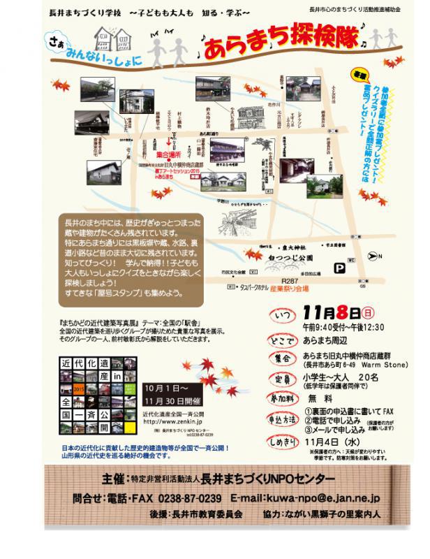まちづくり学校 建物編として「あらまち探検隊」を開催します!あら町のまちなかに点在するクイズを解いて、オリジナルグッズをもらおう!詳細はチラシをご覧下さい。11月8日(日) 9:40~12:30 集合場所 あら町6-49 WarmStone前
