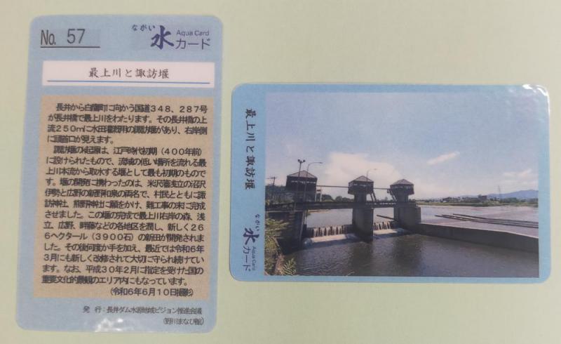 NO57は、「最上川と諏訪堰」です。野川まなび館を利用した方、展示室を見学した方への記念品として無料で配布しています。ご希望の方は、事務所までお声がけください。※発行年度内は無料で配布しています。次年度からは50円の協力金を頂いています。※郵送による配布は受け付けておりませんのでご了承ください。発行 長井ダム水源地域ビジョン推進会議
