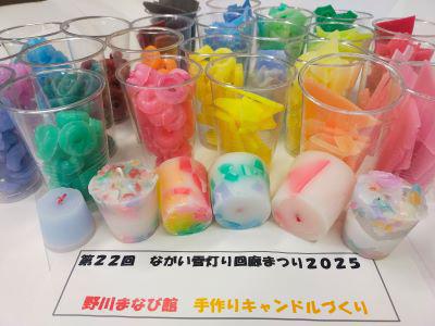 手作りキャンドルづくり日にち:令和7年2月1日(土)場 所:野川まなび館時 間:13時30分から16時まで(最終受付15時)参加費:無料申 込:不要(小学生の方は保護者同伴)カラフルなろうそくのかけらを、組み合わせて「押しカラー」のキャンドルが作れます。キャンディーキャンドルも、ご用意しています(^_-)-☆素敵なキャンドルで「ながい雪灯り回廊まつり」をお楽しみください。お問合せ:野川まなび館0238-87-0605 担当:澤出