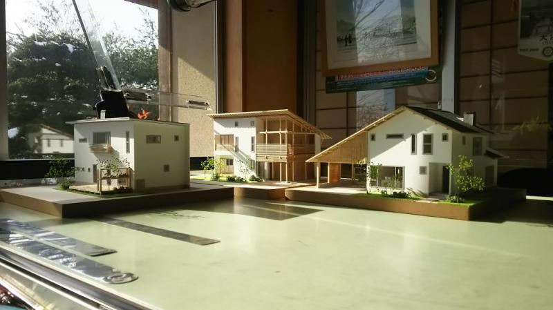 大江町をイメージした”町屋・里山・豪雪”の3タイプ住宅の模型。