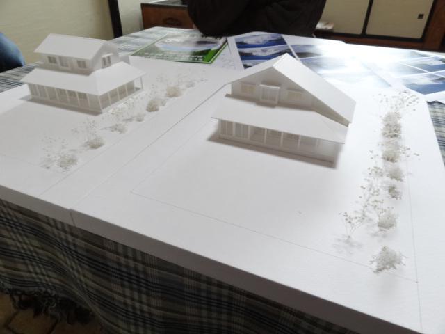 前回の打合せで基本プランはほぼ決定しましたが、屋根の形状をどうするかが懸案事項になりました。図面で描いた立面図では理解しにくいと思い、模型を2案作りました。いつも模型を作って検討します。それは設計者自身も疑問に感じている部分があり、それが解決されるからです。建て主さんにも好評でした。ご家族全員に理解していただくために、次回の打ち合わせまで模型を預けてきました。