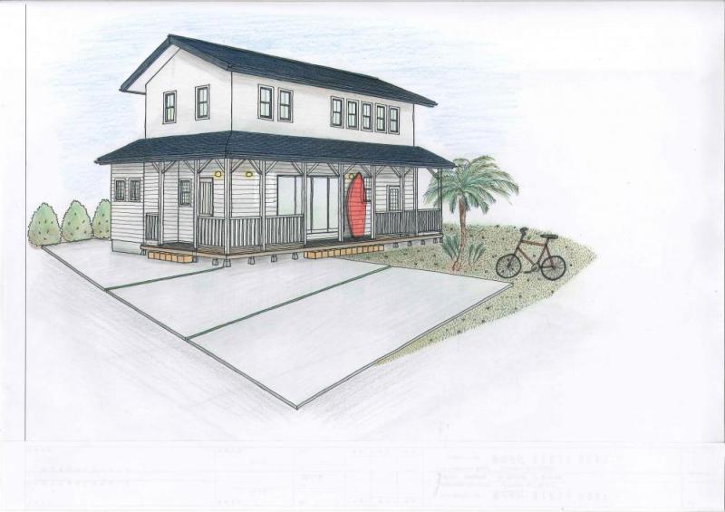 庭と駐車場を確保して、定番のカバードポーチを活用できる様に建物を配置。リビングから庭へつながる空間は、開放感いっぱいです。室内は、日本にいる事を感じさせないアメリカンな印象の部屋になります。