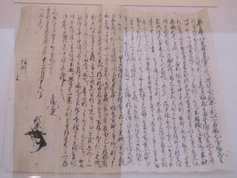 北条か、上杉か、態度を保留していた長尾為景は、大永六、七年ごろに上杉方につきました。これによって北条氏と結んでいた惣社の長尾顕景は窮地に追い込まれ、為景に意見を求めながら、旧主山内上杉家への復帰を求めていました。しかしその最中に上杉家臣の長野左衛門大夫らは顕景を討つ計画を立てていました。事前に察知した顕景は、裏切った福像主を殺害、証拠となる文書を手に入れ、滅亡の難を逃れますが、惣社城攻撃の危機は続いていました。このような状況で顕影はこの書状を送り、為景に上杉氏家臣への復帰工作の推進、援軍として足軽の派遣を要望しています。この中で顕影は、為景を頼るしかなく、必死に為景にすがる姿勢が示されています。(展示解説より)