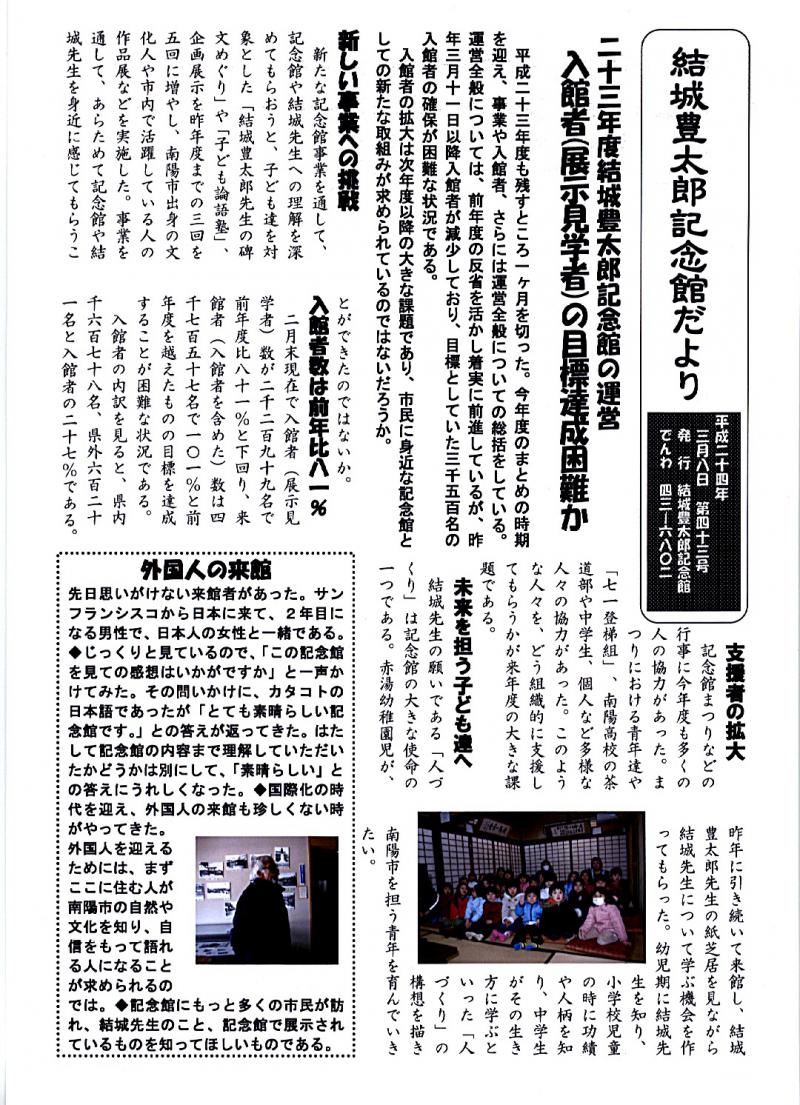 記念館だより43号を発行した。平成23年度がまもなく終わろうとしているので、今年度のまとめを行った。