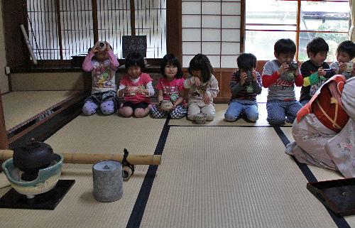 臨雲文庫での赤湯幼稚園年長さんのお茶教室の一こまです。