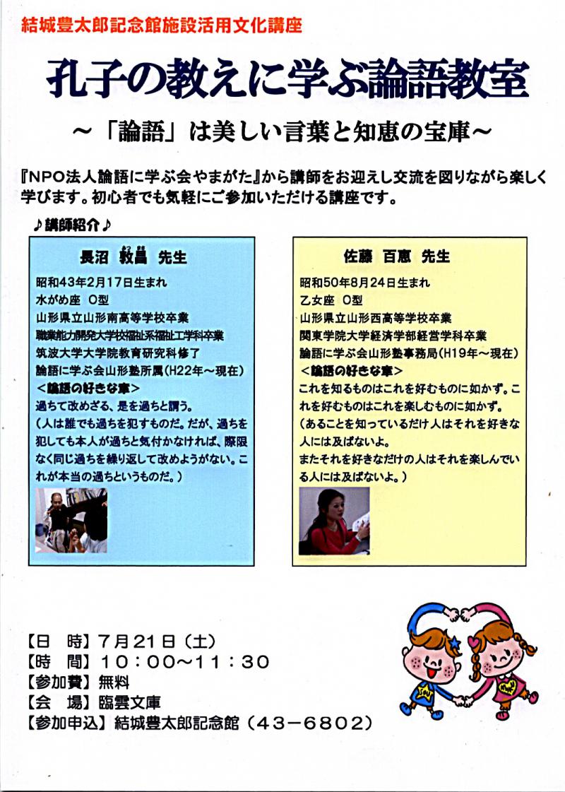 施設活用文化講座の2回目は論語の初歩を学ぶ「孔子の教えに学ぶ論語教室」を7月21日に実施する。