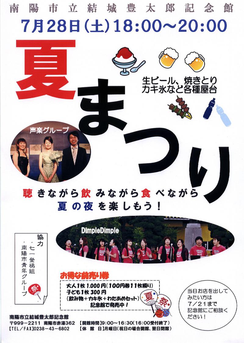 結城先生の命日8月1日に合わせて、今年で3回目となる「夏まつり」を開催する。このまつりには七一登梯組や地域の人々、ゴスペルグループの「ディンプルディンプル」、春にも出演してもらった「高橋沙織とその仲間」によるなどの演奏などの協力で実施する。