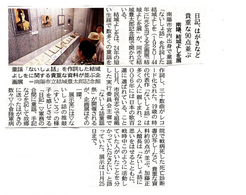9月21日付けの山形新聞の置賜版に、企画展「結城よしを展」の記事が掲載された。なかなかPRの手段がないだけに、新聞で紹介していただけると「新聞で見たよ」と来館される方もいる。