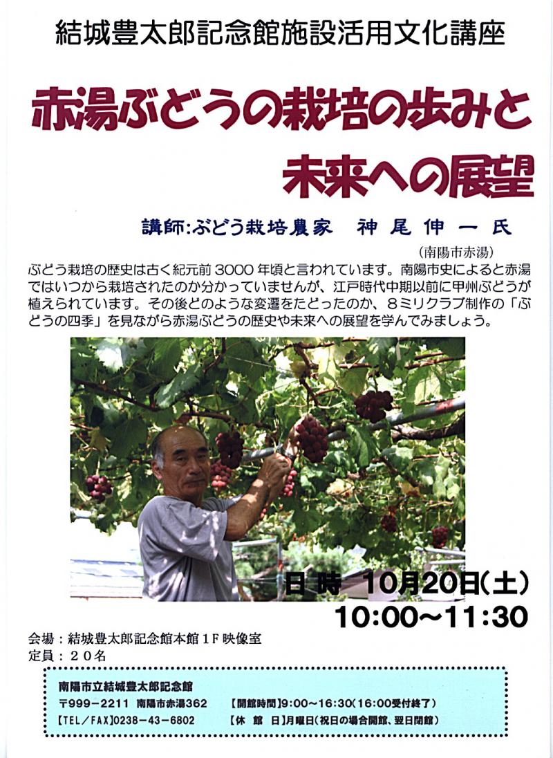 南陽8ミリクラブが制作した「葡萄の四季」を見ながら、ブドウ栽培農家の神尾伸一氏を迎え、赤湯のブドウについて考えてみませんか。