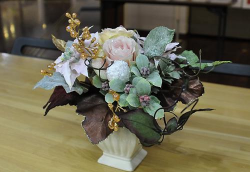 雪がふきつけたように、白いパウダー(?のようなもの?)が表面についていて、クリスマスにもぴったりのアレンジですね。こちらは造花でつくっていただきましたが、「フラワーアレンジメント講座」では、生花によるお正月用のアレンジを教えてくださいます。