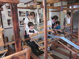 民話の語りを聴き、スライド、資料館の見学の後、機織り体験もし、