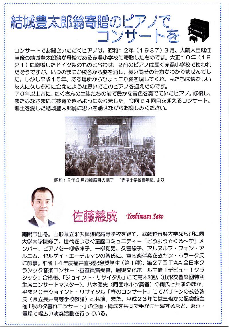 結城先生寄贈のピアノでサロンコンサートを開催。ピアニストは南陽市沖郷出身で武蔵野音楽大学を卒業した佐藤慈成氏。東京を中心に演奏活動していたが、実家がお寺であり、演奏活動のかたわらお寺のお手伝いもしているという異色の音楽家。