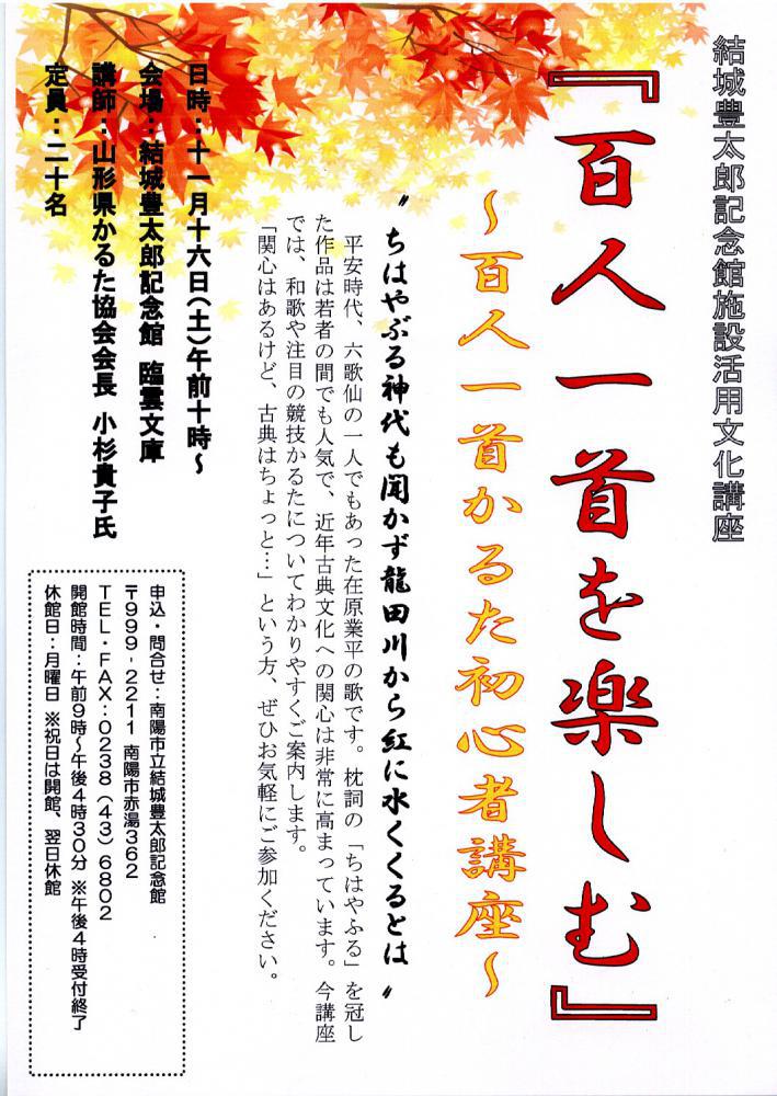 施設活用文化講座の第6回(最終講座)が来る11月19日に開講する。あまりなじみのないカルタ取りであるが、もしかすると一度はしてみたいと思っている方がいるのではないかと、山形県かるた協会会長 小杉貴子氏による指導で開催する。多数の参加をお待ちしています。