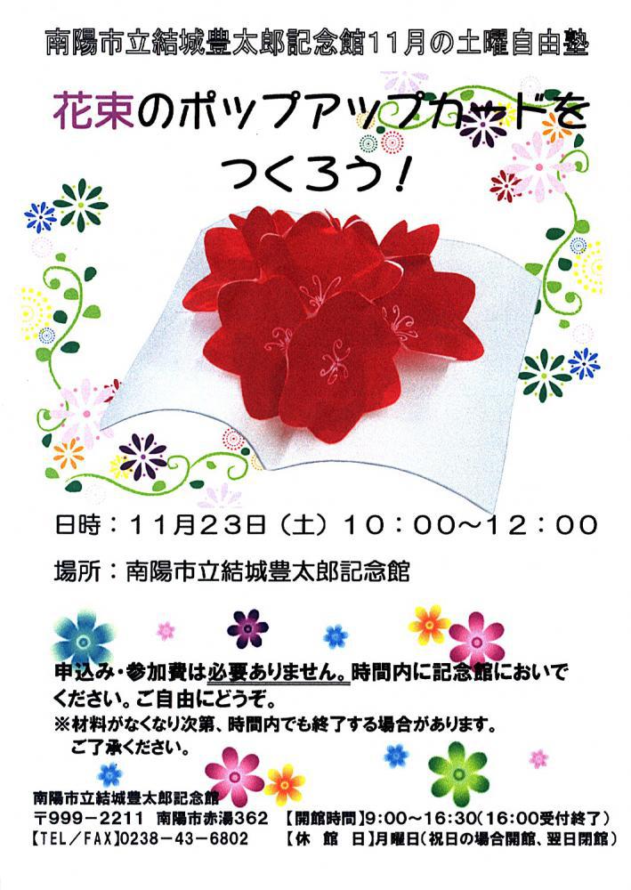 11月の土曜自由塾は、開くとかわいい花が飛び出す「ポップアートカード」づくり。お母さんと一緒につくってみませんか。申し込みの必要もなくちょっと立ち寄ってできる創作活動。お待ちしてます。