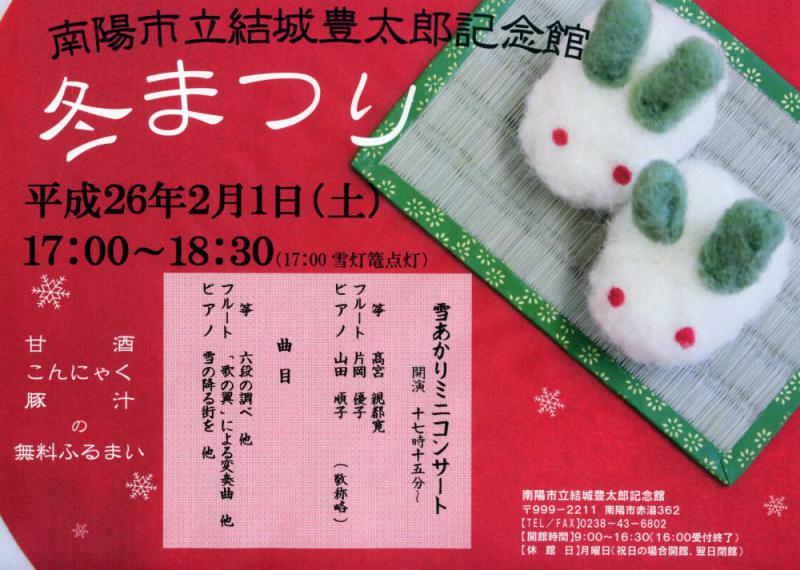 例年になく雪の多い正月が終わり、いよいよ本格的な雪の季節がやってきた。記念館では今年も南陽市雪灯かりまつりを開催する予定である。今年の目玉はなんといってもロビーで行うミニコンサートで「琴とフルート」の演奏会である。寒さが心配であるが、これに加えてピアノの演奏と豪華な顔ぶれのコンサートと、トン汁、甘ざけ、こんにゃくの振る舞いもある。雪灯籠に淡い灯りのもとで、ひと時を楽しんでいただきたい。