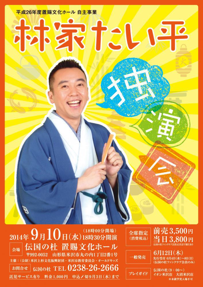 雨模様が続いておりますが、夏の暑い日差しが待ち遠しい今日この頃です。 伝国の杜も湿気で蒸し暑い中、夏のホール公演に向けて日々準備をしておりますが、 いよいよ本日、夏の暑さをふきとばすようなイベントのチケットが発売されます。 その名も「林家 たい平 独演会」!!!9月10日(水)18:00開場18:30開演入場料 前売3,500円 当日3,800円あの笑点のオレンジの人でおなじみの林家たい平師匠が、一昨年に引き続きまたまた米沢へやってきます。 一昨年も米沢を笑いの渦に巻き込んだたい平さん。しかし、今年は一昨年よりもパワーアップしております。『一人でも多くの人に“落語”に出会ってほしい』と、様々な角度から意欲的な活動をされている林家たい平さん。実は今、とっても話題なんです!なんと!今年8月23日(予定)に全国イオンシネマにて、林家たい平さんが“主演”の映画『もういちど』が公開されるんです!しかもこの映画、たい平さんが主演だけでなく“企画”まで務めた、業界注目の映画!落語をメインテーマとして、たい平さんの人柄やスタイルを彷彿とさせた、家族で楽しめる人情ドラマになっているそうで、今から注目のタイトルになっています。そんなノリに乗っているたい平さんの落語を今年も生で聴けるチャンスです。お客さまを元気にしてくれるような親しみやすい素敵な語りで、9月の暑い日々の疲れを吹き飛ばしてくれるでしょう。たい平ファンの皆さま、落語をファンの皆さまはもちろんのこと、落語を聞くのが初めての方、一昨年来られた方、そしてもちろん一昨年行きたかったのに行けなかった人も是非、置賜文化ホールへ是非、お越しください!!伝国の杜スタッフ一同、心よりお待ち申し上げております。