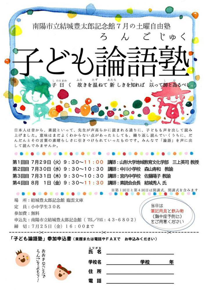 今年で4回目となる「こども論語塾」を7月29日から4日間開催する。今年は山形大学地域教育文化学部の先生にもご指導いただけることとなった。小中学校の先生、大学の教授、成人の論語を勉強している人と、多彩な指導の方々である。小学生対象であるが幼稚園児も参加をOK。多くの子ども達の参加があればいい。