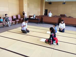 先週は、台風だ梅雨だ地震だ豪雨だとはらはらしっぱなしの米沢でした。今日は一段と暑いですね。そんな中、置賜の子どもたちは暑さの中で元気いっぱい稽古に励んでおります。 6月28日、7月12日の2度、狂言師の山下浩一郎先生を迎えてこども狂言クラブのお稽古が始まりました。今年は、こども狂言クラブの10周年。新たに二人、幼稚園の年長さんと小学6年生の子が入会し、元気いっぱい練習に励んでいます。初めての子たちは最初は緊張していたようですが、山下先生の優しくて明るい指導に励まされ、最後の方には元気に大きな声で謡を謡っておりました。最後には能舞台を隅から隅まで歩き、二人で競争。勝ったのはどっちだ?小学校高学年から高校生までのクラスでは、今年度の狂言のお稽古が開始されました。ある子はこれまでの役をおさらいしたり、またある子は新しい狂言に挑戦したりと今年度の新しい活動に向けて前向きに努力しています。近々の出演予定は8月10日(日)、伝国の杜で開催される「置賜地域芸能・芸術文化祭」で小舞、狂言を披露します。12:00開演。入場料は1,500円でチケット発売中です。皆さま是非お越しください。