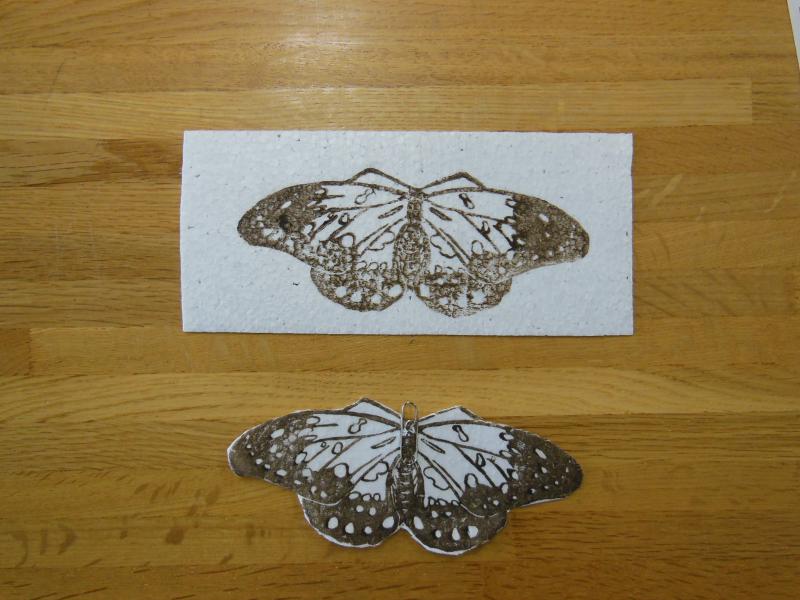 @薄い発泡スチロールに印刷されたオオムラサキに色を塗ります。(色はン売らなくともOK!)