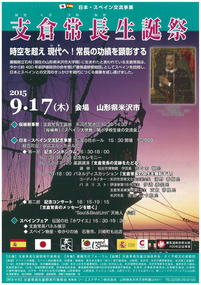 お盆を過ぎたら、めっきり涼しくなりました。秋の気配が漂います。 さて、置賜文化フォーラム共催の5つ目の事業紹介になります。「支倉常長生誕祭」(主催:支倉常長生誕祭実行委員会) は、 日本とスペインの交流のきっかけとなった支倉常長(はせくらつねなが)の生誕の地が米沢市であると言われていることから、駐日スペイン大使等をお迎えして、支倉常長の功績を改めて検証し、支倉常長が米沢の宝であることを理解しながら称えることを目的としています。 内容としては、桜植樹事業と日本・スペイン交流事業の二本立て! 開催日時等は日にち:9月17日(木)@桜植樹場 所:米沢市関地区時 間:13:30〜14:30内 容:桜植樹、スペイン大使館・関小学校生徒の交流会A日本・スペイン交流記念事業(¥3,000)場 所:伝国の杜 置賜文化ホール時 間:16:30〜19:15内 容:記念シンポジウム、記念コンサート("Soul&BeatUnit"天地人)です。 皆さん、9月17日"支倉常長"に思いをはせてみてはいかがでしょうか? チラシはこちら↓http://samidare.jp/abeshuj/box/20150820154251-0001.pdf