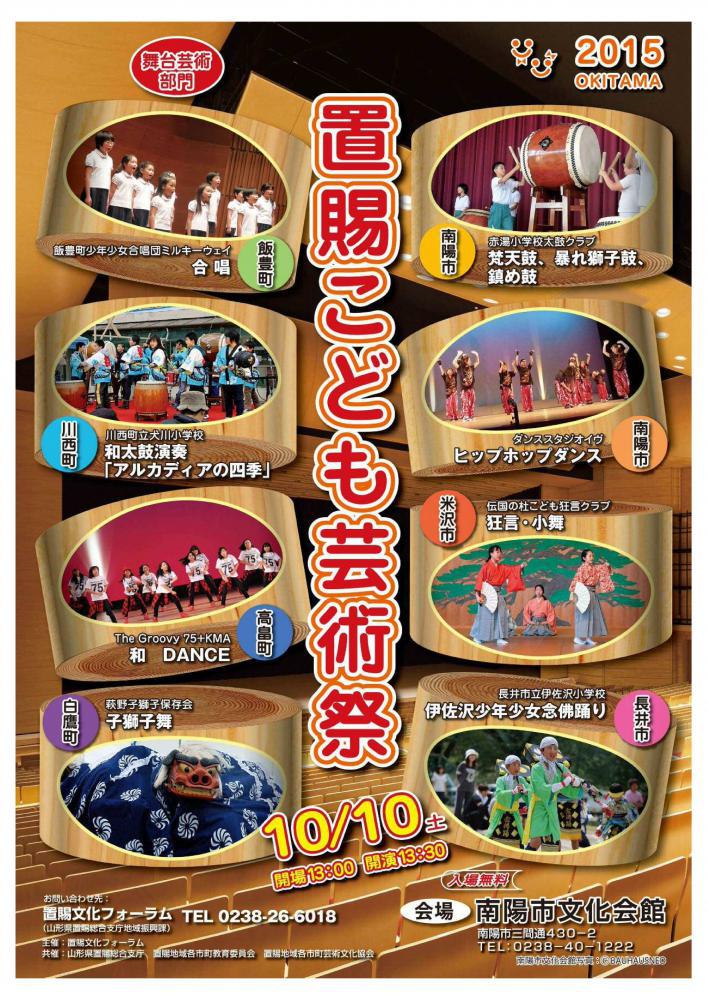 置賜文化フォーラムでは、平成27年10月10日(土)に 置賜こども芸術祭2015 舞台芸術部門 を開催します。※チラシはこちらhttp://samidare.jp/abeshuj/box/%E7%BD%AE%E8%B3%9C%E3%81%93%E3%81%A9%E3%82%82%E8%8A%B8%E8%A1%93%E7%A5%AD%5C%5C%E3%83%81%E3%83%A9%E3%82%B7%E8%A1%A8%EF%BC%88%E6%9C%80%E7%B5%82%EF%BC%89.pdfhttp://samidare.jp/abeshuj/box/%E7%BD%AE%E8%B3%9C%E3%81%93%E3%81%A9%E3%82%82%E8%8A%B8%E8%A1%93%E7%A5%AD%5C%5C%E3%83%81%E3%83%A9%E3%82%B7%E8%A3%8F%EF%BC%88%E6%9C%80%E7%B5%82%EF%BC%89.pdf「置賜こども芸術祭」とは、置賜地域のこれからの文化を担っていく子供たちに、さらに力をつけて欲しいという思いから開催しています。今年度は、舞台芸術部門のほかに、10月4日(日)に吹奏楽部門を開催し、平成28年3月6日(日)に演劇部門を開催予定です。舞台演劇部門は今年で12回目となり、伝統芸能や音楽などの様々な舞台芸術に取り組む子供たちが、日ごろの練習の成果を発表します。芸術祭では大勢の子どもたちが集まり、交流の場ともなっています。今年度は、置賜地域の8団体が出演し、子供たちが元気いっぱい演じ、舞い、歌います。入場は無料となっていますので、ぜひお気軽にご来場ください。会場は新しく建てられた南陽市文化会館です。みなさまのお越しをお待ちしております。■日 時 : 平成27年10月10日(土) 開場:午後1時 開演:午後1時30分■会 場 : 南陽市文化会館 南陽市三間通430−2■出演団体 : (出演順に掲載) 赤湯小学校太鼓クラブ【太鼓演奏】(南陽市) 飯豊町少年少女合唱団ミルキーウェイ【合唱】(飯豊町) The Groovy 75+KMA【ダンス】(高畠町) 萩野子獅子保存会【獅子舞】(白鷹町) 川西町立犬川小学校【太鼓演奏】(川西町) 伝国の杜こども狂言クラブ【狂言・小舞】(米沢市) 長井市立伊佐沢小学校【念佛踊り】(長井市) ダンススタジオイヴ【ダンス】(南陽市)■入 場 料 : 無 料■主 催 : 置賜文化フォーラム■共 催 : 山形県置賜総合支庁、置賜地域各市町教育委員会、置賜地域各市町芸術文 化協会■問い合わせ : 置賜文化フォーラム事務局(山形県置賜総合支庁地域振興課内) 電話0238−26−6018