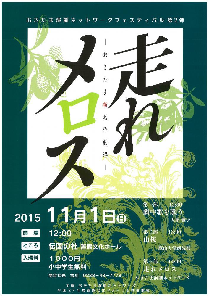 10月に入り、日一日と秋が深まる今日この頃です。皆様、いかがお過ごしでしょうか? さて、置賜文化フォーラム共催の6つ目の事業紹介になります。 平成27年11月1日、置賜文化ホールで開催されますおきたま演劇ネットワーク・フェスティバル『おきたま新名作劇場』(主催:おきたま演劇ネットワーク) は、 置賜地域の若い諸団体、アマチュア演劇人が一堂に会して、市町の枠を超えた広域的文化イベントを催すことにより、地域の活性化を図り、置賜の舞台芸術の向上を目指して開催しているものです。 内容としては、音楽あり、朗読あり、演劇ありと大変盛りだくさんの内容となっています。 開催日時等は日 時:11月1日(日)12時30分〜場 所:置賜文化ホール(米沢市丸の内一丁目2−1)入場料:1,000円(小中学生無料)です。ぜひ皆様、「芸術の秋」「文化の秋」に置賜文化ホールにお越しください。チラシ(表)です↓http://samidare.jp/abeshuj/box/%E8%B5%B0%E3%82%8C%E3%83%A1%E3%83%AD%E3%82%B9%5C%5C20150924175342-0001.pdfチラシ(裏)です↓http://samidare.jp/abeshuj/box/%E8%B5%B0%E3%82%8C%E3%83%A1%E3%83%AD%E3%82%B9%5C%5C20151002170359-0001.pdf