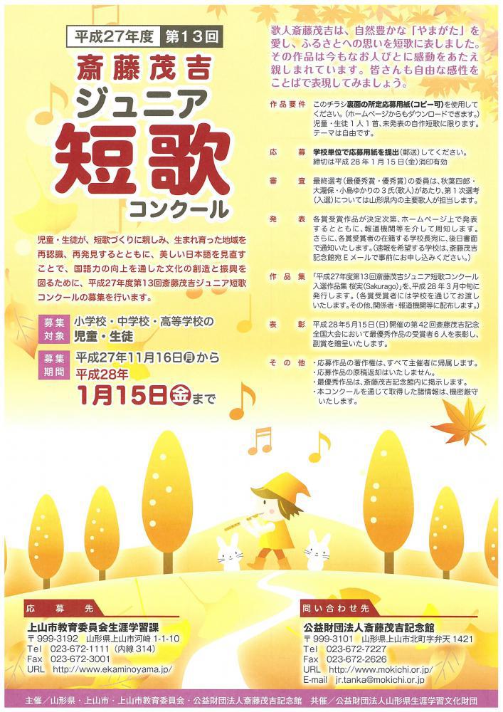国語力の向上を通した文化の振興を図るため、斎藤茂吉没後50年を記念し、平成15年度から実施されている「斎藤茂吉ジュニア短歌コンクール」。第13回目、平成27年度の作品募集が開始されています。対象は、小学校・中学校・高校の児童・生徒。要件は、児童・生徒1人一首、未発表の自作短歌。期間は、平成28年1月15日(金)までとなっております。皆さんの作品をお待ちしています。 詳しくはこちら↓http://samidare.jp/abeshuj/box/%E8%A1%A8.pdfhttp://samidare.jp/abeshuj/box/%E8%A3%8F.pdf
