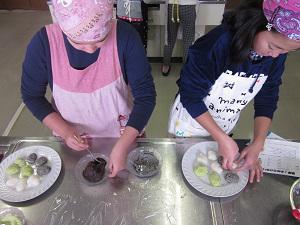 しゃもじで程よくつぶし、まるめて、あんこ、きな粉、ごまの3種類の