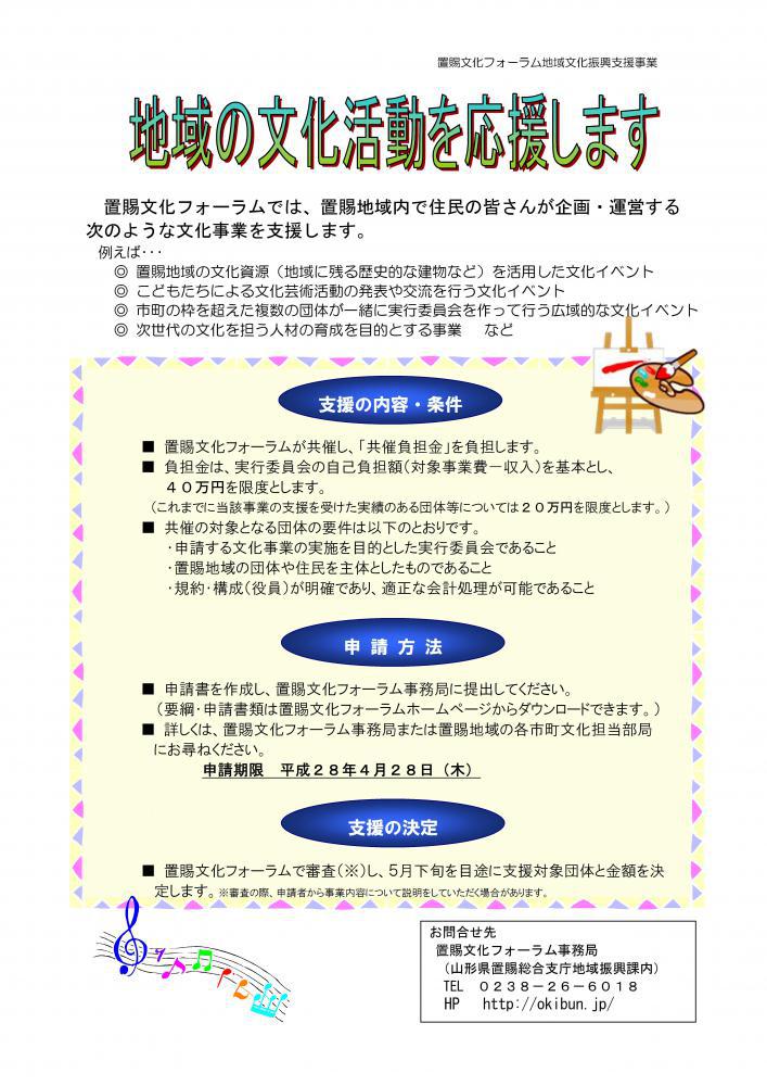 置賜文化フォーラムでは、平成28年度に置賜地域の住民の皆さんが企画運営する文化イベント等の事業を支援します。下記を参考に申請くださるようお願いいたします。●事業の例・置賜地域の文化資源を活用した文化事業・こどもたちによる文化芸術活動の発表や交流を行う文化事業・市町の枠を超えた複数の団体による文化事業・次世代の文化を担う人材の育成を目的とする事業 など●支援内容 共催負担金(最大40万円)を置賜文化フォーラムが負担します。●募集締切 平成28年4月28日(木)●事業要綱等 実施要綱(PDF) 申請書等様式(Word) チラシ(PDF)●問い合わせ先 置賜文化フォーラム事務局(山形県置賜総合支庁地域振興課内) 担当 安部 住所 郵便番号992-0012 山形県米沢市金池7−1−50 電話 0238-26-6018 ファクシミリ 0238-26-6022