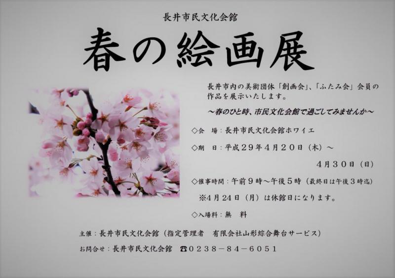 長井市民文化会館「春の絵画展」長井市内の美術団体「創画会」 「ふたみ会」会員の作品を展示いたします。〜春のひと時、文化会館で過ごしてみませんか〜◆会 場 : 長井市民文化会館ホワイエ◆期 日 : 平成29年4月20日(木)〜4月30日(日)◆催事時間 : 午前9時〜午後5時(最終日午後3時まで) ※4月24日(月)は休館日になります◆入場料 : 無料主催 : 長井市民文化会館(指定管理者 有限会社山形綜合舞台サービス)お問合せ : 長井市民文化会館 TEL 0238−84−6051