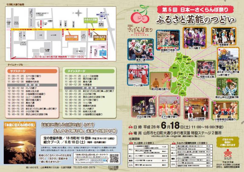 6月18日〜19日にかけて、文翔館前・山形市七日町大通りにて「第5回 日本一さくらんぼ祭り」が開催されますが、その一環として、18日(土)に、山形県内各地に伝わる民俗芸能を紹介する「ふるさと芸能のつどい」が開催されます。これは民俗芸能の価値を周知するとともに、無形民俗文化財の保存・伝承に寄与すること等を目的としています。置賜地域からは、大人団体:「小出の獅子舞」(小出獅子連・長井市)子ども団体:「山上一刀流剣舞」(山上学話会・米沢市) 五十川獅子踊り(少年少女五十川獅子踊り・長井市)が出演します。詳しくはこちらをご覧ください。また、日本一さくらんぼ祭りについてはこちらになります。ご友人やご家族とお誘い合わせのうえ、ぜひ足をお運びください。