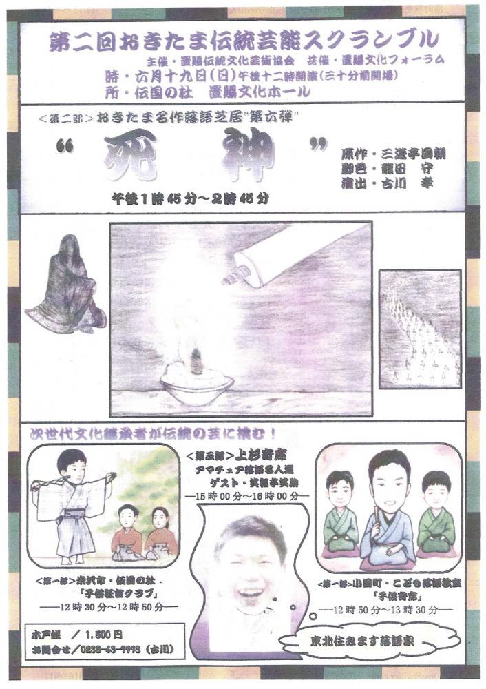 平成28年5月27日の第1回総会にて共催事業として採択し、支援することとなりました10事業について、随時紹介したいと思います。「第二回おきたま伝統芸能スクランブル」は、「おきたま伝統文化芸術協会」が主催する@置賜地域の芸術文化の向上A次世代の文化を担う地域芸能者(子どもたち)の育成と向上B町や市の枠や世代間の違いを超えた交流C若い諸団体の芸能の質の向上等を目的としたイベントです。 内容は、○次世代文化継承者(子どもたち)あ伝統の芸に挑む!○おきたま名作落語芝居「死神」○上杉寄席の三部構成となっております。詳しくはこちらです。皆様ぜひ会場に足をお運びいただき、伝統芸能をご堪能ください。 〜第二回 おきたま伝統芸能スクランブル〜日 時:平成28年6月19日(日) 12:00〜16:00 (←間もなくです!)場 所:置賜文化ホール(米沢市丸の内一丁目2−1)入場料:1,500円