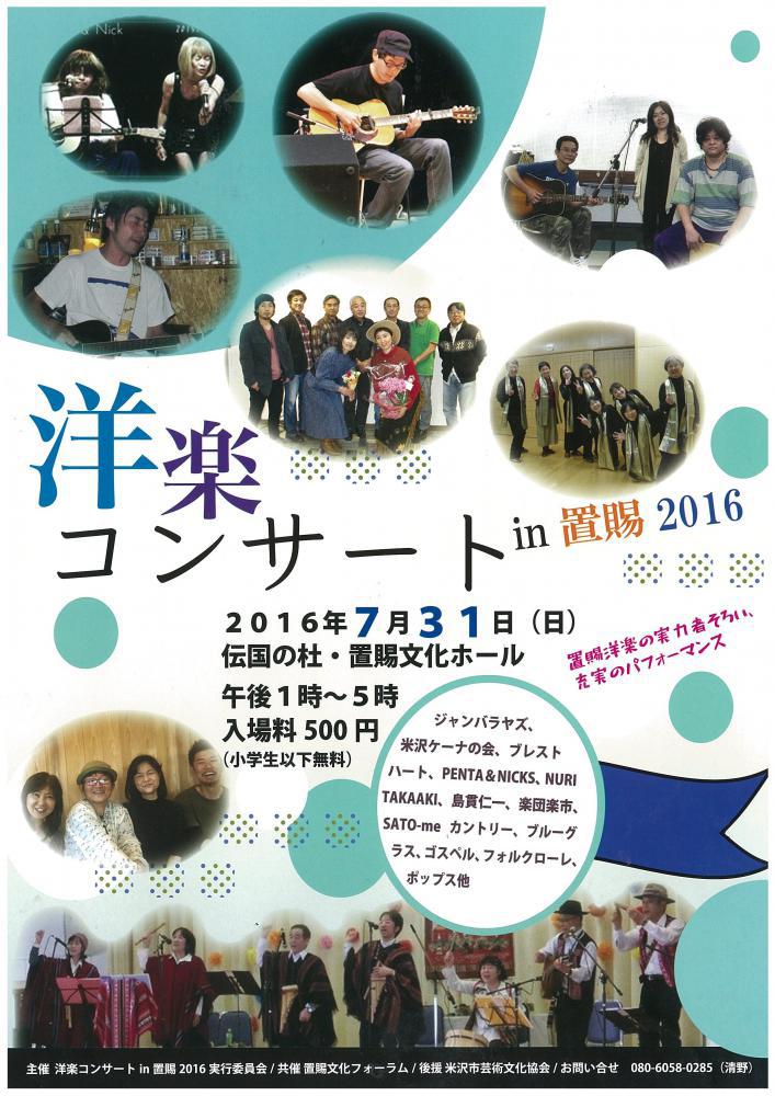 「洋楽コンサートin置賜2016」は、「洋楽コンサートin置賜2016実行委員会」が主催する、センスのいい地域文化の向上に努め、地域間、世代間の垣根をなくし、にぎわいを作り出し、人にやさしく元気のある町づくりに貢献することを目的に開催されるイベントです。内容は、ジャズ、カントリー、ブルースなどのバンド演奏やゴスペルグループの歌などとなっています。詳しくはこちらです。皆様ぜひ会場に足をお運びいただき、多彩な音楽に触れてみてください。 〜洋楽コンサートin置賜2016〜日 時:平成28年7月31日(日) 13時〜場 所:伝国の杜置賜文化ホール(米沢市丸の内一丁目2−1)入場料:500円(小学生以下は無料です)