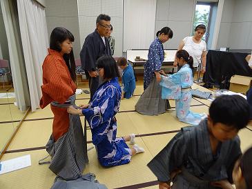 夏休みのとある日、伝国の杜こども狂言クラブでは、袴の着付講習会を開きました。普段なかなか時間がとれず、着られる人だけ、着つけができる人だけで衣装の着替えをしているのですが、せっかくだからマスターしたい、という参加者の願いを実行に移したものです。小学校高学年からは自分で着られるように練習し、低学年は大人が着付けます。狂言衣装の着付けは腰帯を低い位置に決めます。こどもたちの体形にあわせた着崩れしにくい着付け方は、実はとても難しいのですが、講師の本田和也さんから丁寧に指導いただき、コツがあることがわかりました。さて次の目標は、9月11日(日)の「山形県能楽の祭典」での発表です。きりりと締まった袴姿で舞台に登場したいものです。※許可のない写真転載はお断りします。